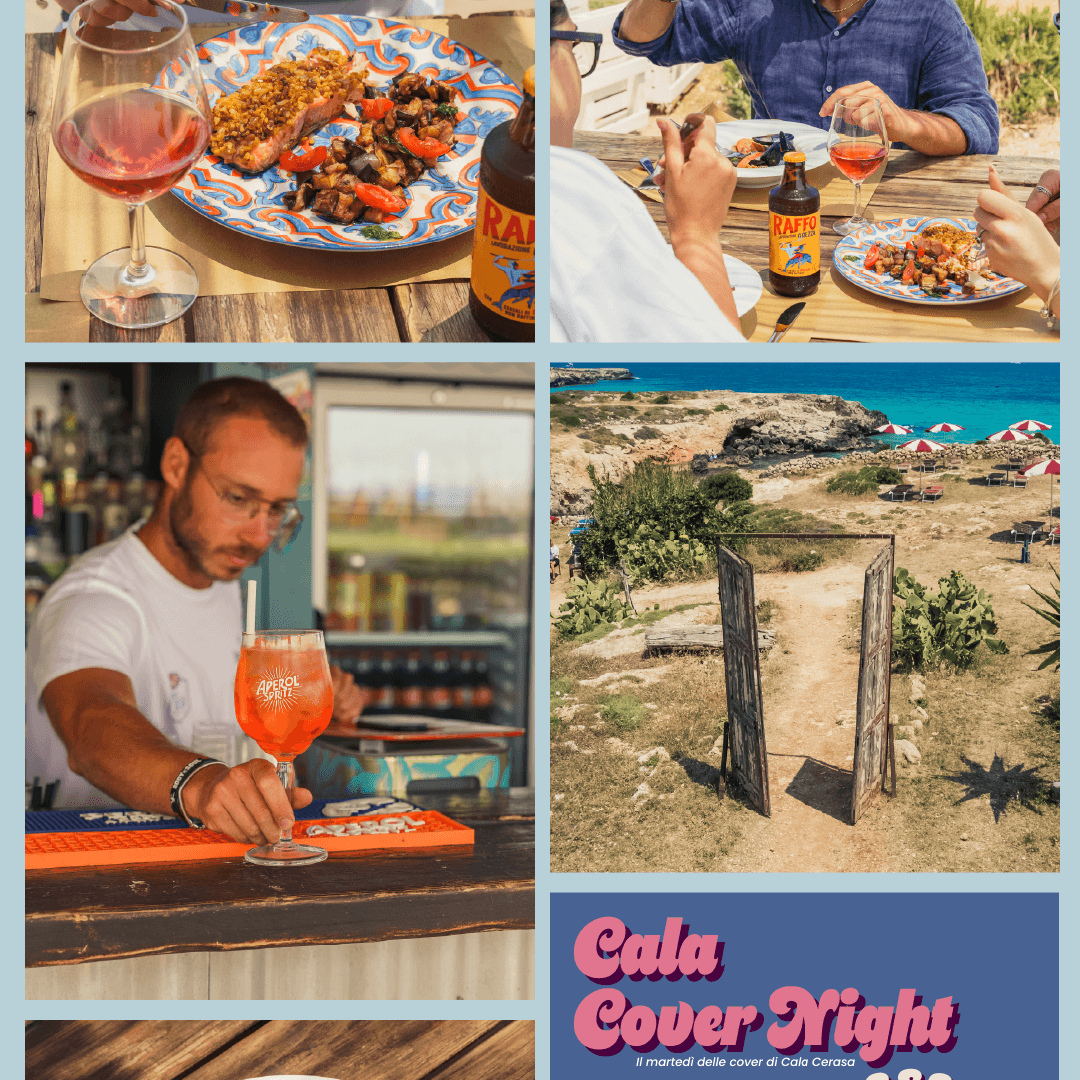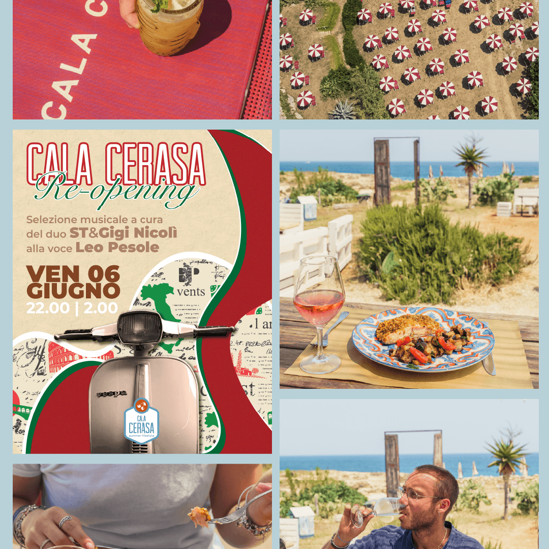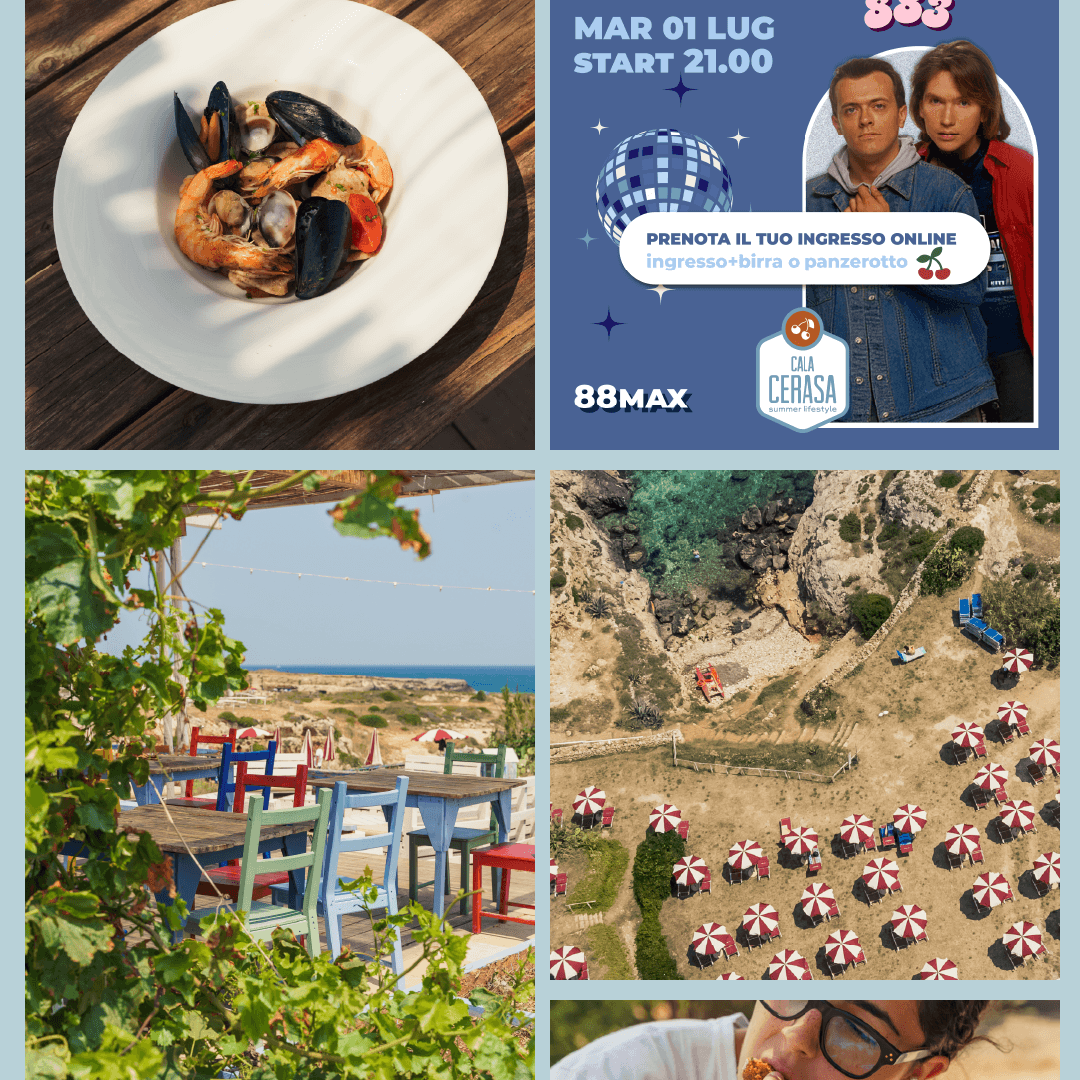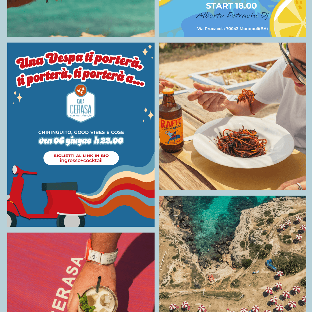 Che ne dici se ci vediamo una cover band vista mare? O un concerto assassino vista mare? O una birra fresca vista mare? Io, sinceramente, ci vivrei vista mare. È questo lo spirito di Cala Cerasa, un lido a Monopoli che non è solo stabilimento balneare, ma anche ristorante, bar ed eventi serali. Un luogo dove la giornata scivola tra sole, cocktail e musica. Quando ci hanno chiamato, l’identità del locale era già forte. Ma chi siamo noi per non farla crescere ancora? Così abbiamo messo le mani su foto, grafiche e contenuti per raccontare Cala Cerasa e tutta la sua energia. • Foto & Visual → shooting per eventi, ristorante, bar e lido. Con un color grading vivace e fresco che ricorda la brezza del mare e la voglia di un tuffo urgente. • Stile grafico → pop-hippie, libero e spensierato, proprio come l’anima di Cala Cerasa. • Social & Ads → contenuti visivi di qualità per una fan base già attivissima, più campagne Meta Ads mirate per spingere le prevendite dei ticket degli eventi serali. E poi ci sono le foto della famosa porta sul mare: ormai un’icona instagrammata da turisti e local in tutte le pose possibili. Noi l’abbiamo resa ancora più riconoscibile. Cala Cerasa oggi non è solo un lido: è una meta di riferimento a Monopoli per chi cerca mare, relax e divertimento. Un posto che tutti conoscono, dove gli eventi fanno il pienone e l’identità del brand continua a crescere. Alla fine, prova a chiedere in giro: chi non conosce Cala Cerasa? Io, intanto, un tuffo me lo vado a fare.