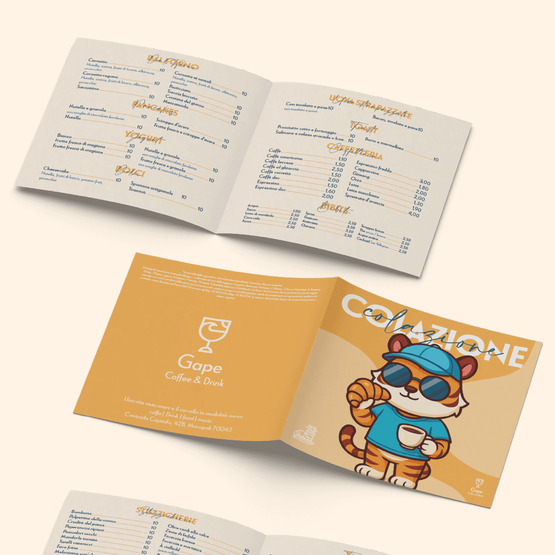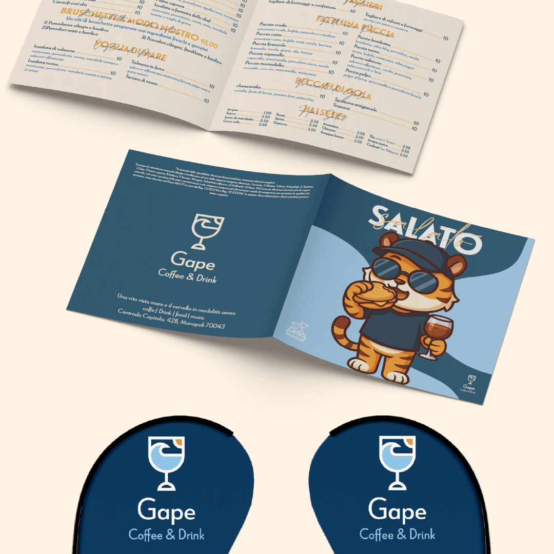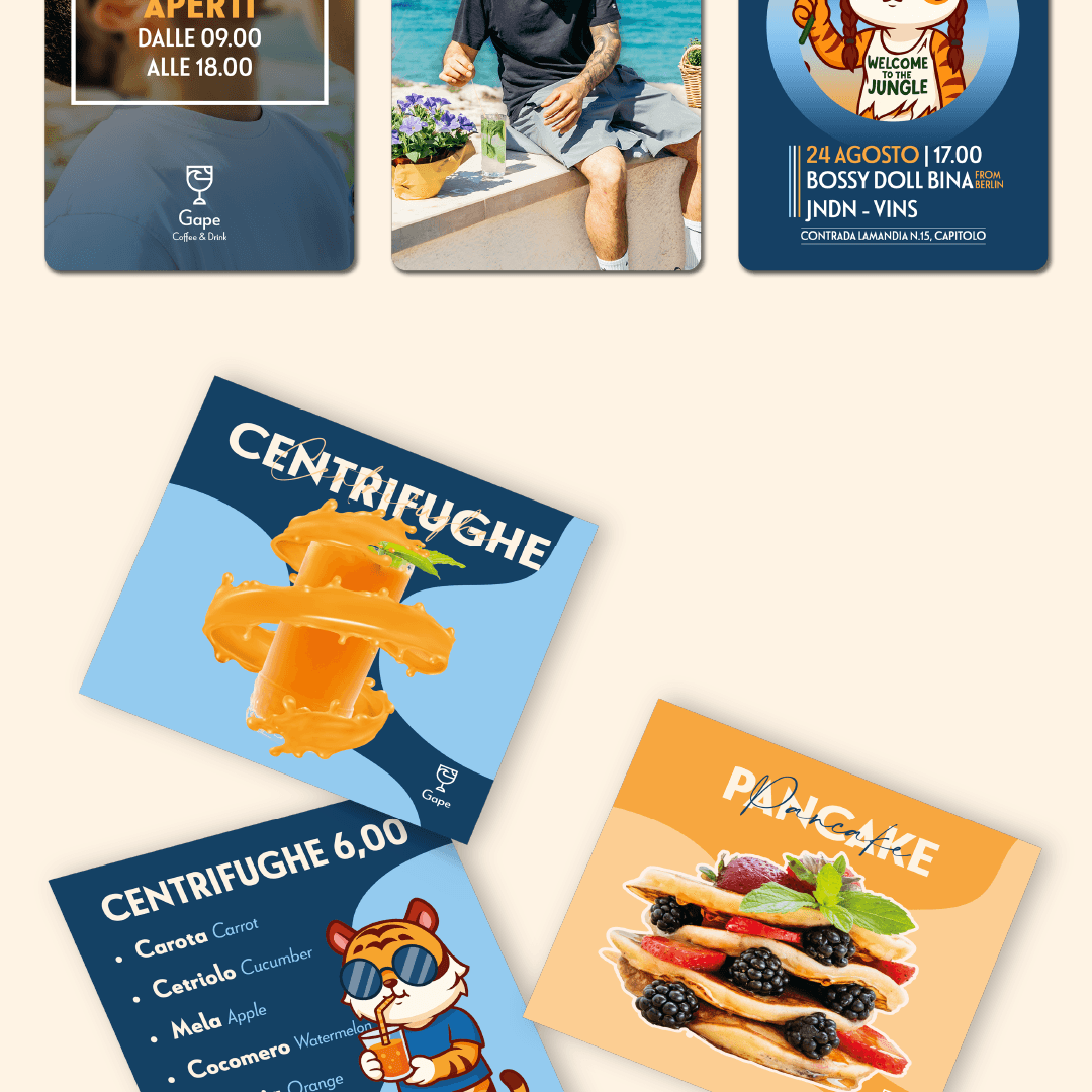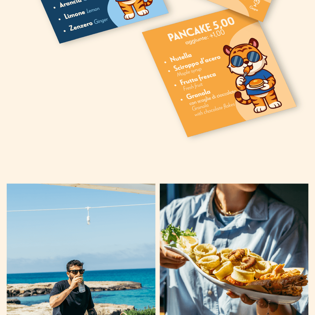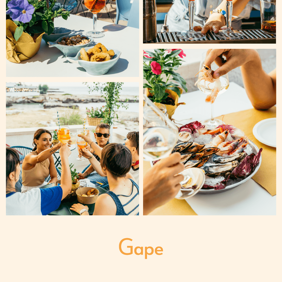 “Gape”… ma come si pronuncia? Boh. L’importante è il significato: “restare a bocca aperta”. E fidati: davanti al tramonto con un drink in mano la mascella scende da sola (senza bisogno di Photoshop). Un bar sul mare a Monopoli che non conosce orari. Al mattino centrifughe e pancake, a pranzo piatti leggeri, al tramonto aperitivi e drink. E quando arriva la sera diventa la scusa perfetta per restare ancora un po’. L’obiettivo? Far conoscere la struttura e renderla un punto di riferimento non solo per i monopolitani, ma anche per chi arriva dai paesi vicini. L’idea era chiara: diventare quel posto dove fermarsi per scappare dal casino quotidiano. La nostra soluzione Naming & Logo → “Gape” e un logo che unisce calice, mare e sole: semplice, diretto e memorabile. Brand identity → uno stile fresco che parla la lingua del posto. Foto & Video → shooting food e lifestyle per raccontare la location (perché anche uno spritz merita la sua scena). Menu & Grafiche social → design colorati e pop, illustrazioni cartoon e una mascotte ironica. Uno stile giocoso e riconoscibile, perfettamente coerente con l’identità del locale. Social & Ads → copy leggeri e modi di dire locali. Campagne Meta Ads mirate agli eventi serali e soprattutto ai tramonti della domenica con dj set. Ma poi com’è andata? Gape è diventato presto un punto di riferimento local. I primi clienti sono arrivati subito e il brand si è fatto notare per autenticità e stile. Con i titolari protagonisti di foto e video (due personaggi locali discutibili e noti a livello locale che è meglio “a scansarli”), il locale è diventato quel posto che tutti taggano nelle stories. Oggi Gape non è solo un bar: è il posto dove vai per bere, restare a bocca aperta e farti il contenuto perfetto per Instagram.
