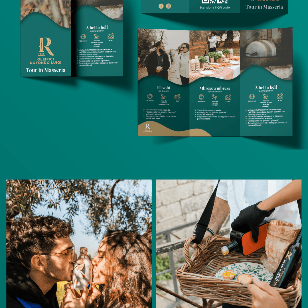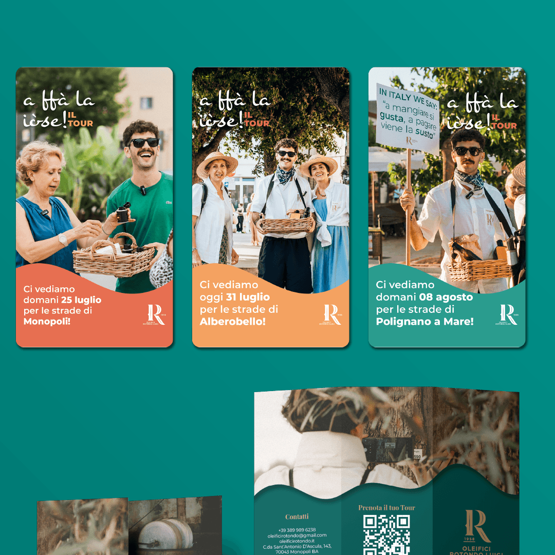 Il cliente arriva e ci fa: “Ragazzi, io faccio un olio da paura e organizzo tour fighissimi ma nessuno mi fila”. E noi, sinceri: “Boh”. Poi ci siamo messi a fare i seri (più o meno), tra brainstorming, briefing e call random, e abbiamo trovato la ricetta giusta. Oleifici Rotondo Luigi è un oleificio pugliese a Monopoli che produce olio extravergine di oliva dalla coltivazione alla molitura, fino alla vendita. Ma non solo: organizza tour in masseria, visite ai terreni con ulivi secolari, esperienze nel frantoio ipogeo e degustazioni che ti fanno uscire dicendo “ok, ora basta supermarket”. Gli obiettivi Rinfrescare l’immagine del brand, attrarre più clienti locali e turisti, diffondere l’olio anche al Nord e all’estero. Insomma: passare da “oleificio di quartiere” a brand pugliese riconosciuto. La nostra soluzione • Immagine coordinata → restyling grafico di listini, divise e confezioni, tutto in uno stile moderno e coerente. • Naming & Packaging → nuova linea premium: Terramare (nome e design by noi) + restyling delle etichette storiche (Longevo e Sedicidicembre). Palette pop, rilievi e nobilitazioni che al tatto sembrano corteccia d’ulivo. • Foto & Video → shooting con tonalità accese ma naturali: campagna e artigianalità che ti arrivano dritte al naso. • Storytelling → dai volti storici ai nipoti: un passaggio di testimone comunicato con autenticità per conquistare un pubblico più giovane senza perdere i clienti storici. • Social & Copywriting → TOV genuino e amichevole, a volte tradizionale, a volte pop. Rubrica educativa per distinguere l’olio artigianale pugliese dal “finto extravergine” da discount. • Ads → campagne di vendita mirate per Nord Italia ed estero, basate su un’analisi di mercato ad hoc. • Local marketing → tour promozionali nei paesi limitrofi con assaggi gratuiti: vestiti da campagnoli, ma con olio che ha conquistato Francia, Belgio e USA. I risultati? Brand identity moderna, etichette che spiccano sugli scaffali, social che raccontano genuinità e tour che portano ordini dall’estero. Oleifici Rotondo non è più “solo un frantoio”: è diventato un ambasciatore dell’olio pugliese artigianale. Abbiamo preso un frantoio storico e l’abbiamo trasformato in un brand con i contro zebedei. E ora l’olio scorre che è una bellezza anche su Instagram.